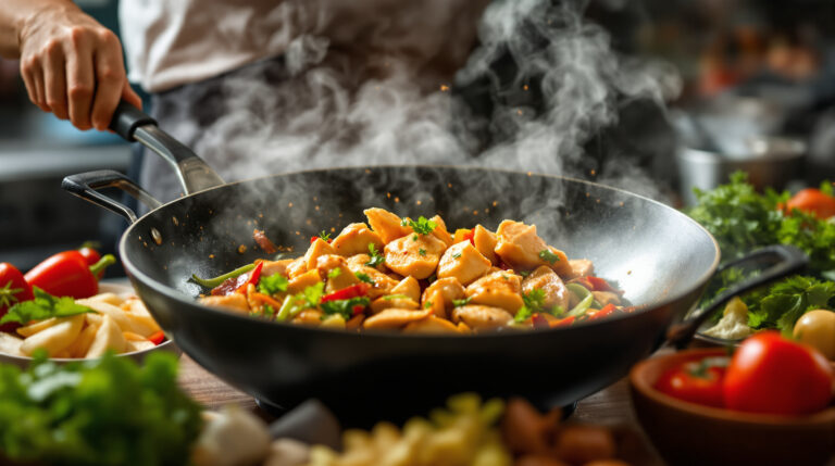 Le wok est souvent considéré comme le meilleur allié pour préparer un sauté de poulet chinois. Sa conception permet une circulation optimale de la chaleur, ce qui favorise une cuisson rapide et efficace. En utilisant un feu vif, le poulet se dore rapidement à l’extérieur tout en restant juteux à l’intérieur. Ce procédé est essentiel pour préserver les saveurs et les textures des ingrédients. De plus, le wok permet d’incorporer facilement les légumes croquants, ajoutant ainsi une dimension supplémentaire au plat. L’utilisation d’un wok garantit que chaque ingrédient est cuit de manière homogène, évitant ainsi le risque de brûler certains éléments tout en laissant d’autres sous-cuits. Pour un résultat optimal, il est recommandé de ne pas surcharger le wok, afin de maintenir une chaleur élevée et de favoriser l’épaississement des sauces. En résumé, disposer des bons ustensiles, notamment le wok, et savoir les utiliser correctement, sont des étapes clés pour réussir votre recette de poulet chinois. Avec une bonne préparation et une cuisson adéquate, vous pourrez savourer un plat savoureux et digne des plus grandes tables asiatiques.