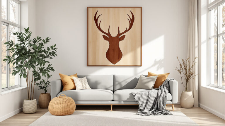 Pour un look plus contemporain, un tableau représentant un cerf en bois gris, comme le modèle SNOW de 55 x 55 cm, s’harmonise parfaitement avec un design minimaliste. Ce type de décoration évoque une ambiance nordique, idéale pour les amateurs de bricolage et de décoration personnalisée.
